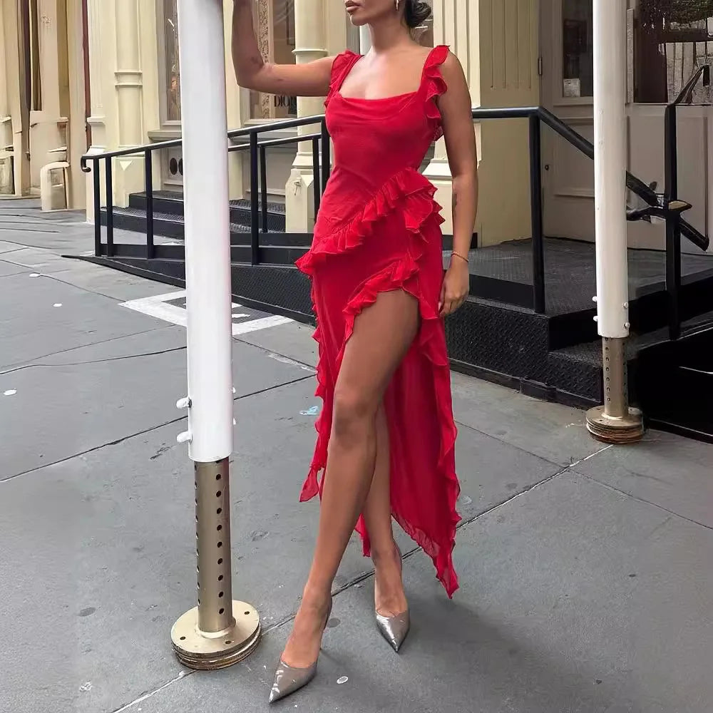 Este vestido largo es la elección perfecta para lucir elegante y femenina. Con un diseño fluido y detalles de volantes, resalta tu silueta mientras aporta un toque romántico y sofisticado.