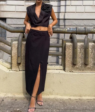 El vestido Elegancia Serena destaca por su diseño minimalista y detalles elegantes. Confeccionado con materiales de alta calidad, ofrece un ajuste cómodo y favorecedor. El escote en V y la cintura definida realzan la figura, mientras que la falda larga y fluida con una abertura sutil añade un toque de elegancia y movimiento suave.
