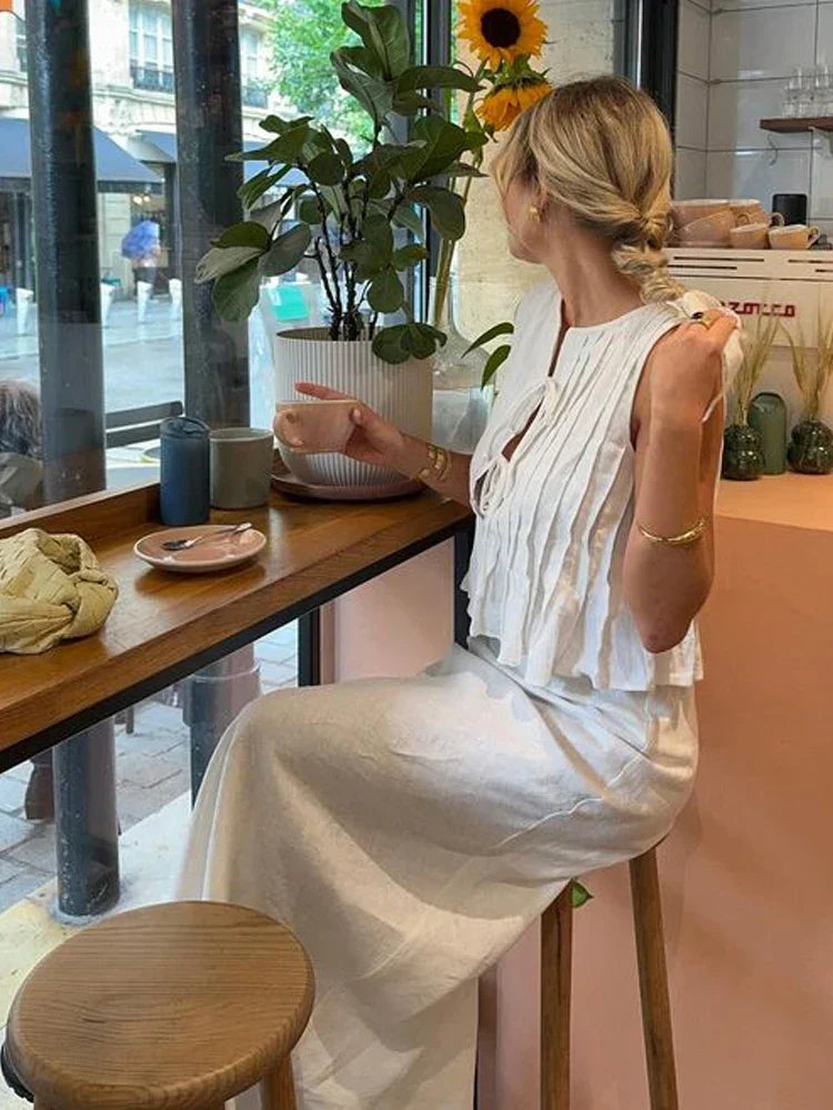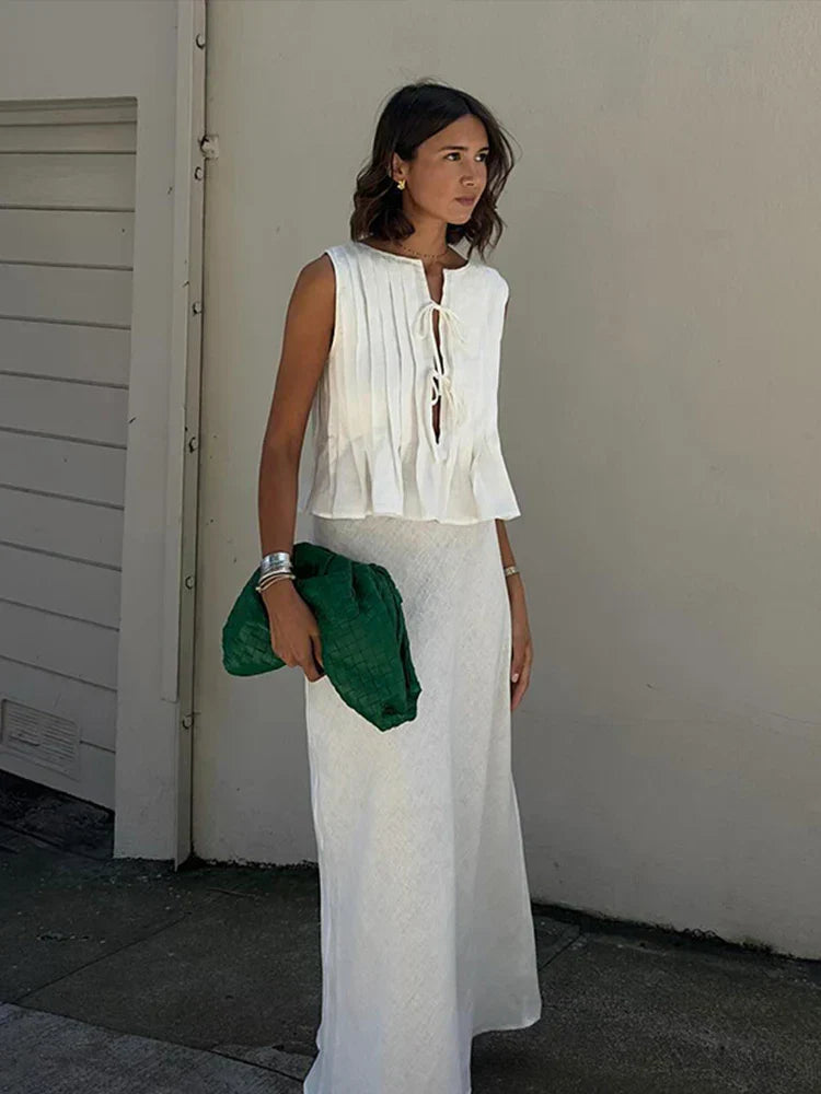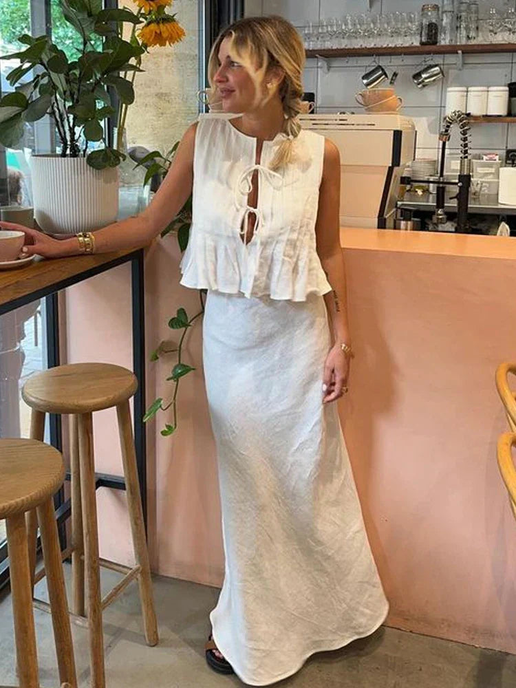 Este conjunto es extremadamente versátil, convirtiéndose en una pieza esencial para tu guardarropa de verano. Combínalo con sandalias y accesorios minimalistas para un look casual y chic, o con tacones y un sombrero elegante para un estilo más refinado. El Winnie™ Conjunto de Falda de Lino es la elección perfecta para cualquier ocasión, asegurándote siempre destacar con estilo y frescura.